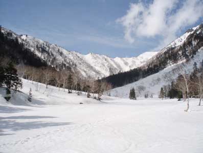 飛騨側から槍ヶ岳へ登るルートとして、夏は飛騨沢沿いの登山道が一般的だが、 積雪期には雪崩を避けるため尾根伝いのルートがとられる。 中崎尾根は積雪期の槍ヶ岳への代表的なルートだ。 昨年末、行った時は深い雪に阻まれ、滝谷避難小屋にたどり着くのに2日かかり撤退した。 春は雪がしまっているのでもう少し頂上に迫れるだろうと思った。 ゴールデンウィークは大勢の人が入って雪が足跡だらけになることが予想されるので 1日早い4月25日(金)に出発することにした。 千葉の自宅を出たのは前夜4月24日夜20:30頃。中央高速を走り中央道原PAで車中泊。 5時に起床して、諏訪SAで朝食のうどんを食べ、7:15頃新穂高温泉に到着した。 身支度をして7:40 小雨の中を出発したが、雨はすぐに上がった。バスターミナルで登山届けを出した。 穂高平までの道のりのうち1/3くらいは雪にうもれていた。 駐車場から1時間半で穂高平到着。ここから雪が多くなった。 10:30分白出沢到着。数年前は渡渉に苦労したが、今回は沢床は雪に埋もれて渡渉する必要はなかった。 〈写真は白出沢〉 |
