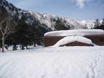 槍平小屋は1階部分がほとんど雪に埋もれていた。 営業はしていないが小屋番が一人で雪下ろしをしていた。 軽く挨拶をして冬季小屋を使用させてもらう話をした。 |