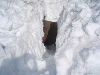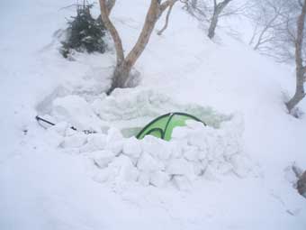 すでに雪は降っていたが、午後からもっと天気が悪化する予報だったので、 テントを張る場所は強風に耐えられるように、雪の斜面を掘り下げ、そこから出る雪のブロックを周りに積み上げた。 まだ、午前中だったので、気分的ににも、体力的にも余裕があった。 横から見るとテントが見えない位になった。 一時雪が止んだのでテントの外で昼食の焼きそばを食べた。その後また雪が本降りになってきた。 夕方ラジオを聞いていたら、岐阜県付近に強力な積乱雲が発生しており、突風、雷、雹(ヒョウ)、 竜巻などのおそれがあり、18:40に岐阜県全域に警報が発令され、少なくとも1時間は警戒が必要だと言っていた。 少なくとも1時間、ということは1時間経っても安心できないということではないか。 携帯電話で見る山の天気の雲の画像を見ると21時ころには槍ヶ岳頂上から雲が去りそうなので、 21時を過ぎたら安心しても良いだろうと考えた。 その夜は時折強い風が吹き、どこかに雷が落ちる音がした。雪はずっと降り続いた。 21時を過ぎても雪がやむことはなく降っていた。 夜はあまり眠れなかった。 |