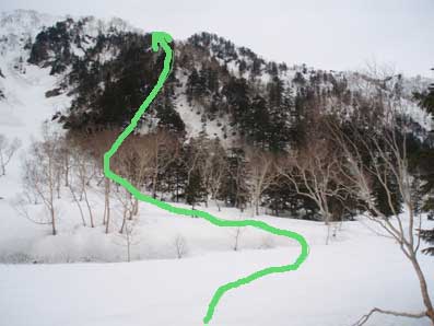 千丈乗越直下の岩稜の取り付きまで登ったが、 気温の上昇で雪がグズグズの部分とカチカチの部分が混ざった不安定な状態になっており、 降りる怖さを考えるとこれ以上登っていく気力が湧かなかった。 11:00撤退決定。 写真の赤い点のところが今回の最終到達地点。 傾斜が急で雪が不安定なところは後ろ向きで降りた。 飛騨沢を登っていく人たちは槍ヶ岳山荘に泊まるようで、午後になってもじりじりと登っていった。 雪崩に遭わなければよいが、と思って見ていた。 |