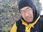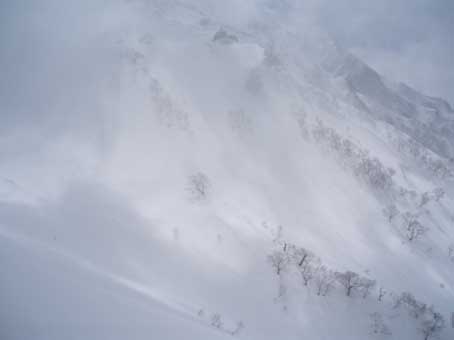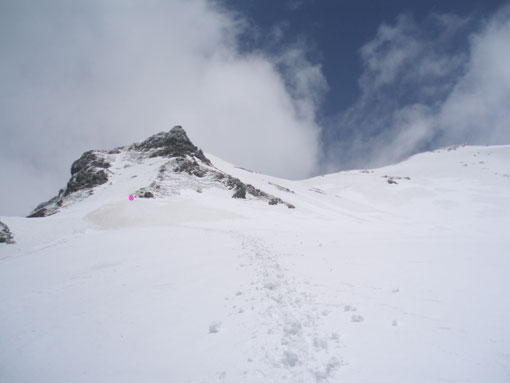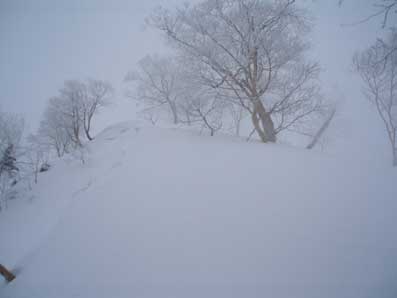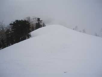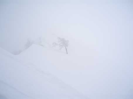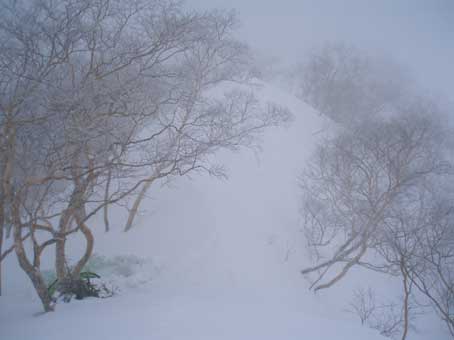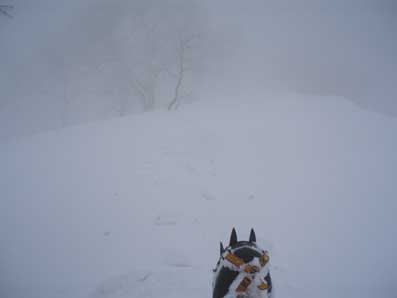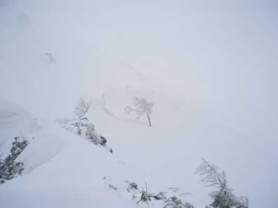 しかし登り始めるとすぐにホワイトアウトになった。 動くのが怖いのでじっと晴れるのを待った。 少し先が見えるようになったところで少し進んでは、また視界が不良になり待つ、というのを繰り返した。 |
