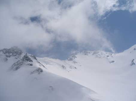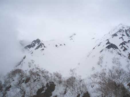 | 4/26 | 曇りのち雪 | 4:00起床、 5:50出発ー10:15中崎尾根2420m(N36°20'20"、E137°37'46")地点到着、幕営 |