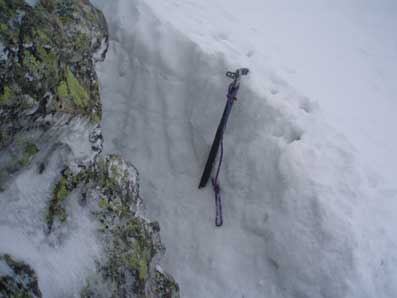 ![]() 岩陰をピッケルで掘って風よけにして、 ロウアルパインのザックの背当てに入っているビバーク用マットに座って待った。 |