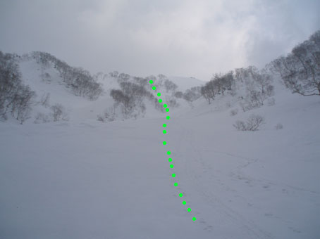 4月26日(土) 4時起床。朝食はスパゲッティー(ペペロンチーノ)簡単でおいしかった。 ニンニクのにおいが食欲をそそった。 5:50出発。 中崎尾根への取り付きはうっすらとトレースが続いていたのでそれと分かったが、 最近登っている人はいないのか、登り始めるとほとんどトレースが分からなくなった。 それでも迷うようなところではないし雪もそれなりに締まっており、快調に登って行けた。 この日天候が崩れるのは午後からだと思っていたが、登り始めるとすぐに雪が降り出した。 |