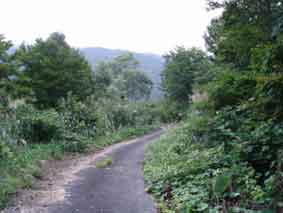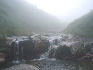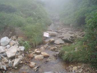 5時半頃桜坂駐車場に到着した。数十台とめられるスペースがあり、 半分位車がとまっていた。 有料駐車場とかかれていたがお金を払う仕掛けがない。(帰りがけに取られた) 駐車場にテントを張って夜明かししている人たちもいたが、トイレが遠いので あまり快適なところではない。 トイレは橋を渡って車道を100メートルくらい戻った道ばたにあった。 出発の用意をしているとバスで団体さんが到着した。 ガイドに率いられた中高年の団体で準備体操をしていた。 それを横目に見ながら5:50出発した。 橋を渡って来た方へ200メートルほど戻り、左岸沿いにある舗装された工事用の林道に入った。 この林道をどんづまりまで進んでしまうといけないようで10分ぐらい歩いたら左へ入っていく道に入り 沢に出る。 |