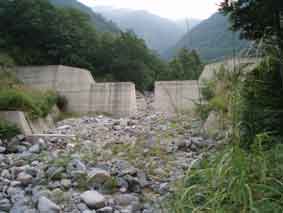 沢に出たところには真ん中が開いた大きな堰堤がある。 ここまで数個の堰堤があるようだが、この堰堤が最後である。 スムーズに来られた。 ここからはしばらく伏流で水のないゴーロ帯を登っていく。 天気は薄曇りだった。 |
