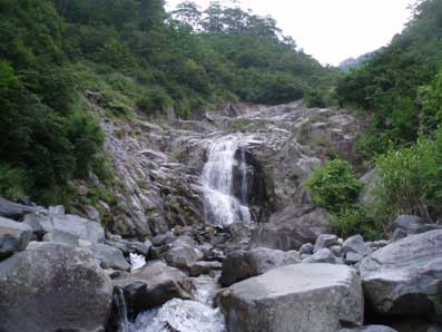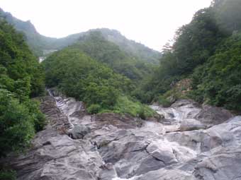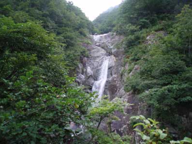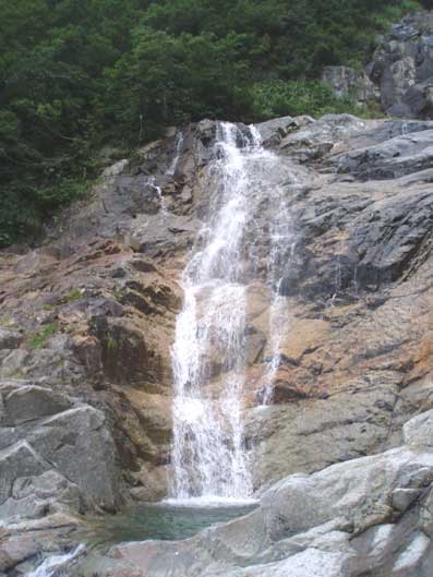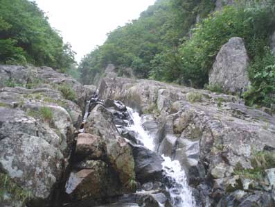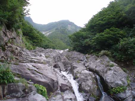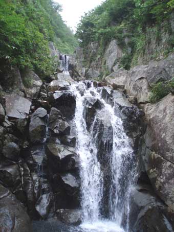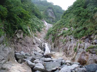 奧に上方左側から滝が落ちてきているのが見える。 これが次のスダレ状美瀑と思われる。 |