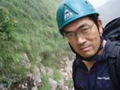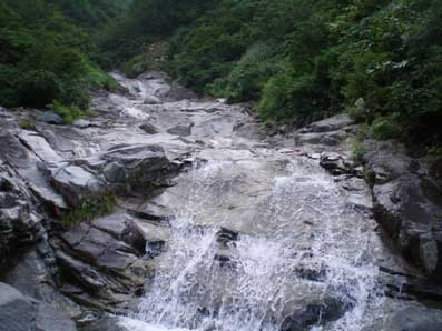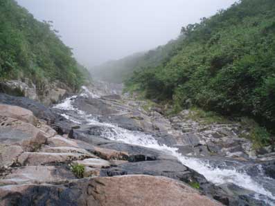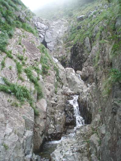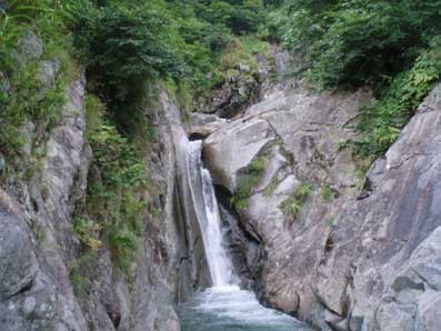 9:03ゴルジュ最後の滝 水流左側にボルトが2カ所打ってありスリングが垂れていた。 それにはさわらず、左側を登って行った。 最後に落ち口の方へ移るところが少し緊張した。 天気が悪化して増水してきたらいやだなと思っていたので これを登りきった時、安心感と満足感がこみ上げてきた。 |