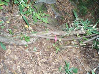 ある程度登ったところで、木に赤テープが付いた所があり、 これを目印に沢方面へ下る。 気が付かないともっと上へ登ってしまうかも知れない。 |
