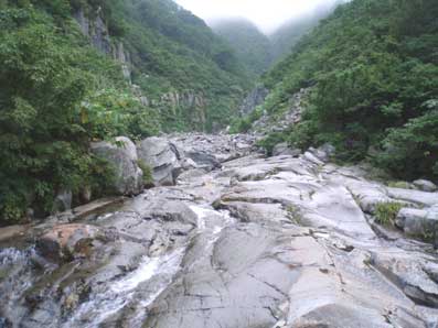 上流には岩盤を洗うように流れるナメが数百メートル続く。