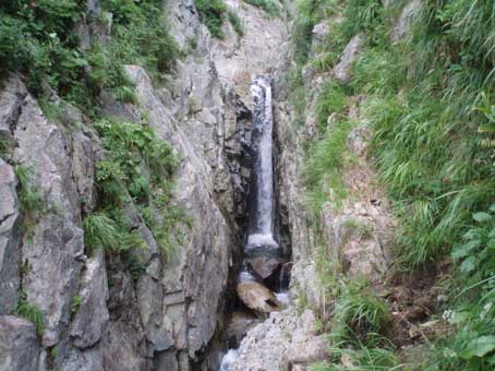すぐにゴルジュが現れ、奥に垂直なトイ状の滝が見える。 ここは左手に巻き道があるのでそこを登っていった。 木をつかみながら登るような急傾斜の道だ。 |