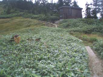 11:30 小屋前には10人くらいの人々が休んでいた。 朝駐車場で準備運動をしていた団体さんだ。 その人たちの話を聞いていたら、関西からのツアーで、明日はもう一つの百名山の苗場山を登るらしい。 ザックを下ろし沢靴をスニーカーに替えた。 一休みして空身で巻機山へ向かった。 |
