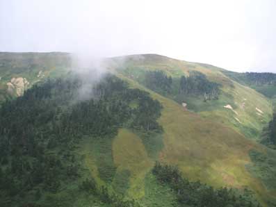 ナメを登りながら振り返る。 ガスはでているが天気はさほど悪くない。 ![]() |