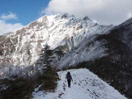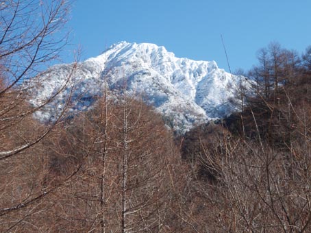 始めのうちは林道を登っていく。この日は快晴無風で良い気分だった。 時折現れる阿弥陀岳も真っ白できれいだった。 G隊員と話をしながら登っていたら、南稜の取り付きへの分岐を見落とし、 中央稜への道をしばらく進んでしまった。 私の記憶では河原を渡ったあと、いきなり急登になるはずだったのだが 少し違うなと思い地図を見直すとかなり行き過ぎていることが分かった。 引き返すとはっきりした分岐があった。 なんでこんなところを見落としたのだろうと思うような所だ。 河原を渡って尾根の取り付きで休憩した。10:40 尾根への登りは急だがほんの15分くらいで稜線に出られる。 ここも眺めが良くて休憩に良いところだ。 |
