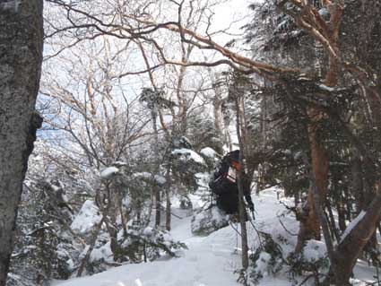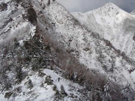いつも単独行が多いのだが、今回はG隊員が後ろから写真を撮ってくれた おかげでいつになく私の登っている姿の写真が多くなった。 P2を過ぎてすぐ風が強く雪を顔に吹き付けた。 この日は昨晩の雪と風でトレースがほとんど見えず歩みが遅くなった。 眼鏡に雪が凍り付くと視界が悪くなるので時々拭いた。 もしかしたらP3の直登ルートを登ろうかと考えていたが、 取り付きもはっきりせず気分に余裕も無く、一般的なP3ガリーへ向かった。 P3ガリー手前でロープを付けた。 取り付きにはボルトとワイヤーが露出していたが、 固定ロープはあったとすれば雪の下だった。 ボルトにG隊員のビレーを取り、私がロープを付けて先行した。 雪がたっぷりあって登りやすかった。 今回は30メートルのロープなので、P3ガリーの長さには全く足りないことは 分かっていた。 早めに確保支点を取る必要があり、雪を払ってハーケンを1本打った。 余りしっかり打ち込めなかった。 風が強いので笛で合図をしてG隊員を呼んだ。 G隊員も笛を持っていて返答をして登ってきた。 (ハーケンは抜く余裕がなかったので、今度どなたか行ったら抜いてください。 元々このルートには中間支点は全く無かったと思います。) 次の確保支点は岩角にテープスリングをかけて取った。 その次にようやく右手の灌木に届いた。 最後は右寄りへ登り稜線に出る直前の灌木に支点を取った。 |