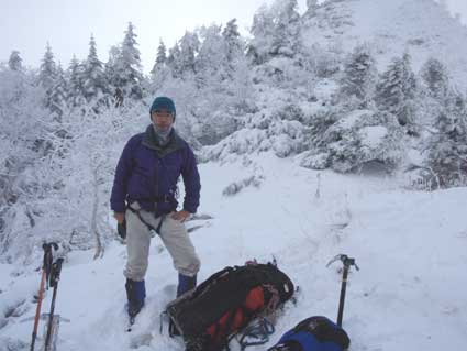御小屋尾根方面へ行くところは初めのうちはしごなどかかっているところがある。 中央稜との分岐のところで先行組のトレースは中央稜へ向かっていたので、 我々はどちらへ行こうか少し迷った。 トレースがある方が下りも楽かと思って、中央稜方面へ少しすすんだが、 すぐにトレースが見えなくなったので途中から御小屋尾根方面へ進路を変えた。 雪は深く膝くらいまで潜ったが下りだったので余り妨げにはならなかった。 樹林帯まで下りてきて風がなくなりほっとした。 この尾根の下りも相当疲れたが、途中から天気が回復し、気分を軽くしてくれた。 舟山十字路には16時頃帰着した。 前に行ったことのあるルートでも天気が違うと、全く違った経験ができると感じた。 |