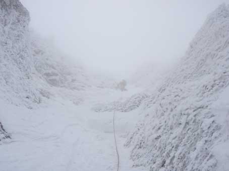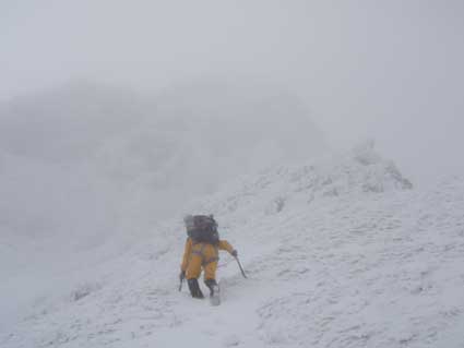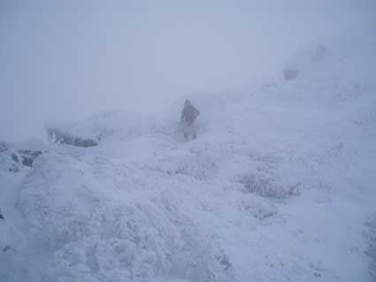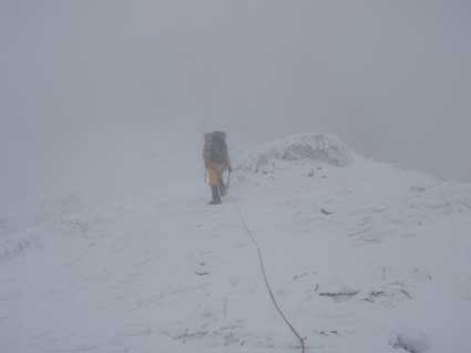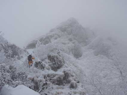 P3ガリーを登り切ったのが11:00頃だった。 ここを登るのに1時間半くらいかかった。 あとはP4から頂上へとすぐに着くと思っていたが、風が強く、雪が深く 1歩1歩に体力を消耗し時間がかかった。 視界も悪く気分は暗かった。 G隊員の手袋が凍ってしまい凍傷になりそうだというので、 私の厚手のフリースの手袋とオーバーグローブを貸した。 私は薄手のフリースの手袋で寒さを感じていなかった。 P4の左側へ回り込むトラバースで1箇所やな所があったと記憶していたが、 この日は余りきわどいとは感じなかった。 しかしこの辺は「ロープを付けたまま登った。 そのまま簡単な岩場を登り、頂上直下は少し右側へ回り込みながら登って ガスの中に頂上の標識が見えた。 後ろから2人組が登ってきた。 |