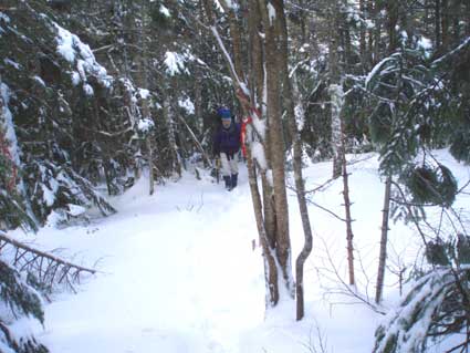 | 立場山頂へ続く尾根は樹林帯だ。 | 積雪は10センチくらいで先行者のトレースが続いていた。 |