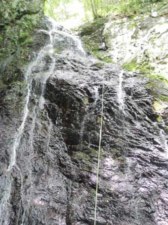 時間がない場合はウスバ林道を利用して下山してもよいが、 その上の20メートルの滝も登ってみたかったので先へ進んだ。 8メートルくらいの滝を一つ登り二股を左へ進むと、 この沢のもう一つの核心部、、左俣の20メートルの滝にでた。12:30到着 この滝も水量が少なかったせいか、あまり恐怖感を抱かなかった。 ロープなしでも登れそうだったが、高度があるので、 せっかく持ってきた30メートルのロープを使ってみることにした。 本には40メートルロープが有った方が良いと書いてあったが、 滝の落ち口で適当な確保支点まで届かなかったらハーケンを打てばよいだろうと思った。 出発点のアンカーは少し遠い立木に取った。ザックもおいていった。 ソロエイドにロープを通し、ハーネスに固定。 少しずつロープを繰り出しながら登っていった。 下の方は手がかり足がかりとも豊富だが、傾斜がきついので早めに1本ハーケンを打ちビレーを取った。 少し登ると傾斜が緩くなり、残置ハーケンもあり、ビレーをとり安心しながら登っていけた。 大満足! 滝の落ち口すぐのところには、確保支点が見あたらず、少し離れた立木を確保支点にするために 短いスリングで30メートルのメインロープを延長しなければならなかった。 |