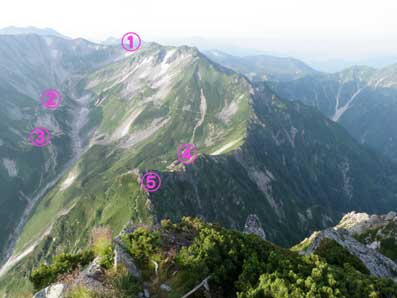 剣岳の頂上から北側へ延びる稜線には3つの大きなギャップがある。