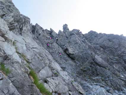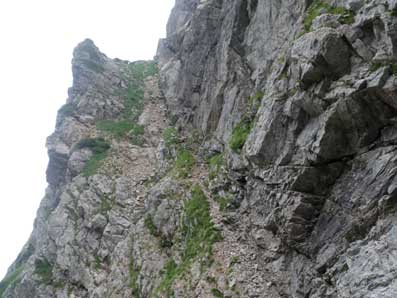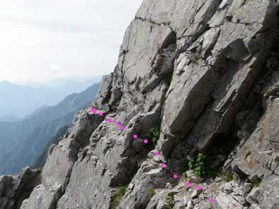 ![]() 良く写真でみる岩棚のトラバース。 一カ所足場が悪い所があるが、 そこにはハーケンにスリングが垂れているので不安無く通れた。 |