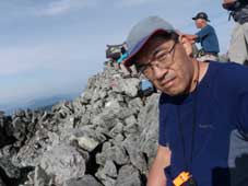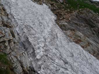 ![]() すぐ近くに雪渓があり、ピッケルできれいな部分を掘って口に入れたり、ペットボトルに詰めたりした。 気温で溶けた部分を飲もうという算段だ。これは美味しかった。 |