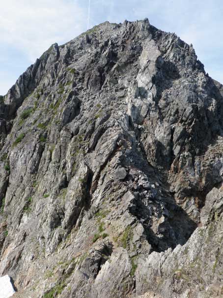 三ノ窓からみた小窓ノ王の南壁の斜上バンド 下から見るとかなり急傾斜に見えるが、登り始めてみると傾斜はさほどではない。 途中まで固定ロープがあるので安心だが、上部はロープがないザレた斜面で滑りやすい。 ここを下降するのであれば、かなり気を使うだろう。 |