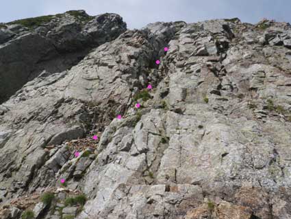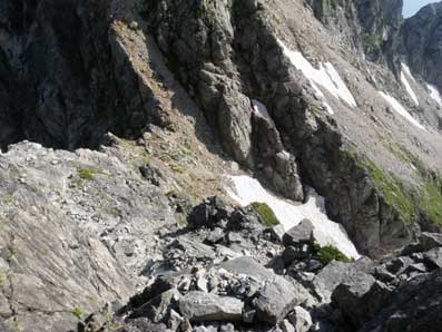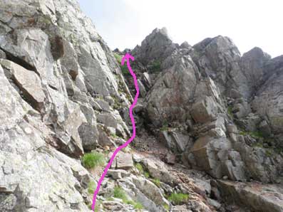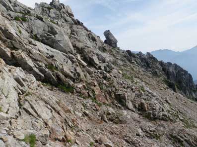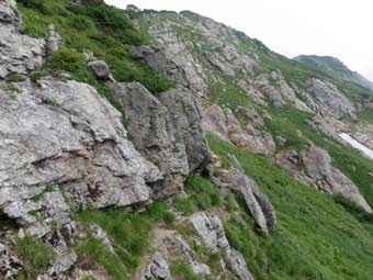 ![]() 恐らくここが稜線上のコルと呼ばれている所だろう。 他人のHPの写真にもよくこの写真があり、どこを通るのだろうと思っていたが、 下の方のトレースをたどると左下の写真の岩棚のトラバースへ出る。 |