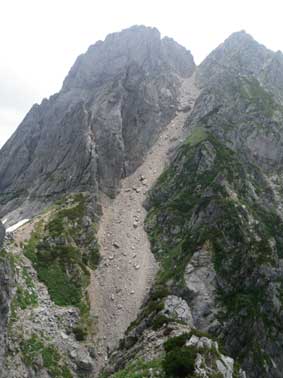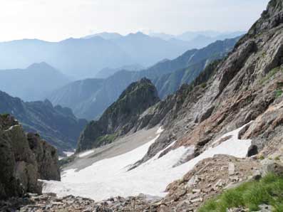 池ノ谷乗越から池ノ谷ガリーを見下ろしたところ。 ここは浮き石、落石の多い悪名高い場所だが、予想していたよりも穏やかな風景だった。 二人登ってくるのが見えた。 私が降り初めて落石を起こすといけないので、二人が登り切るまでしばらく休憩する事にした。 夫婦のようだった。 「縦走ですか、クライミングですか」と聞かれ、「縦走です」と答えたら 「まだ時間が早いから何処へでも行けますね」と言われた。 気持ちが和んだ。 上部はトレースがはっきりしており、慎重にそれをたどっていった。 少し進むと右から落石があった。 先ほど八ツ峰の八峰上にいたパーティが下りてきて、それに伴って落石が生じていた。 パーティから少し待ってくれと声がかかったので待機した。 |