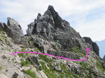 ![]() この斜面の下りも傾斜が急だ。 降りはじめると下の方に大きな岩(赤↓)が見えるが、そのあたりがトラバース道の始まりだ。 その向こうに見えているのが小窓。 |