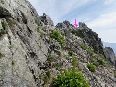 池ノ谷乗越から池ノ谷尾根の頭を見上げた写真。 私は赤点線のガリーを降りてきたが、途中大股開きで突っ張りで身体を支えなければならないところもあり 怖かった。 こうゆうところは靴底の硬い重登山靴よりも、柔らかい軽登山靴の方が軽快に降りられるだろう。 私の降りてきたガリーよりも進行方向左寄り(写真では右)のリッジに移動することを勧めているレポートもあった。 よく見ると下の方右寄りの岩に○と↑→が書かれている。 全行程のなかで、ここの下りで一番気を使った。 10:20池ノ谷乗越に降り立った。想像していたよりも狭いところだ。 |