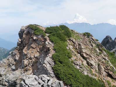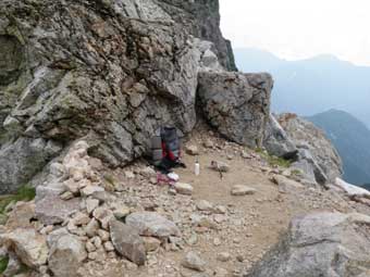 ![]() 30分くらいかかって三ノ窓に降り立った。 これで核心部は過ぎたと思い、ほっとした。 幕営適地の平地があり、ゆっくり休んだ。 |