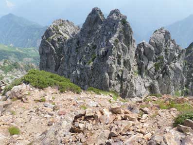 池ノ谷尾根の頭へでると八ツ峰やチンネが見える。 ちょうど八峰上にクライマーがいた。 そこからまたルートを選びながら降りていくのだが、浮き石が多く緊張する。 一度大きな落石を起こし、八峰のクライマーを驚かせてしまったが、幸い下には誰もいなかった。 落石と共に自分が滑落してしまったら大変だ。 |