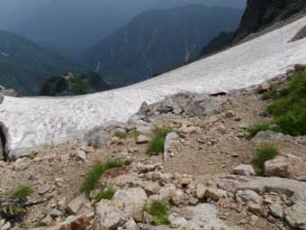 このわずか数メートルの雪渓を横断するために、12本爪アイゼンとピッケルを持ってきたのか、 と少しがっかりしたが、わざわざ持ってきたのでアイゼンを付けた。 今度また来るとしたら、軽登山靴に6本爪アイゼンで良いと思う。 ピッケルはあった方が心強いだろう。 傾斜は急だ。短時間で横断し、すぐにアイゼンをはずした。 |