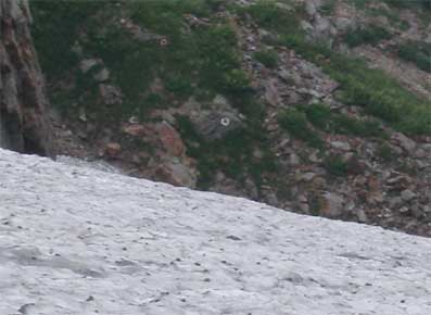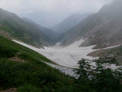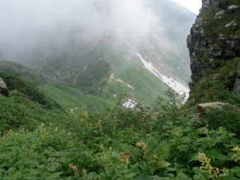 しばらくするともう一つの雪渓が出てきたが、こちらも予想よりずいぶん小さい物で、 傾斜は緩かった。 ここでもせっかく持ってきたアイゼンをつけた。 時折ガスに覆われたりしたが、天気の大きな崩れはなかった。 |