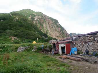 ![]() 6:50仙人池ヒュッテ。玄関口に立つと愛想の良い女性が出てきた。 「昨日は池ノ平でテントですか?するとその前は北方稜線ですか?おひとりで?最近は北方稜線へ行く人が多いですね。ゆっくり休んでいって下さい」と言ってくれた。 |