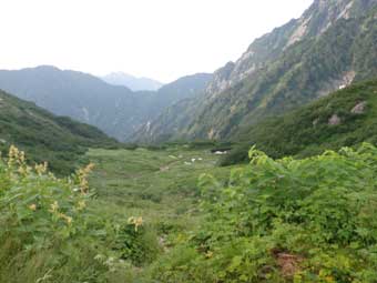 8/21(金)(4日目) 朝5:30まで起きられなかった。 段々起床時刻が遅くなっていった。 朝は小雨が降っていた。 スパゲッティ・ペペロンチーノを食べ荷造りをするころには小降りになっていた。 暑いので合羽は着ず、スパッツだけ着けて出発した。6:30 イギリス人は少し先に出発した。 左の写真は少し歩いて幕営地を振り返って撮ったもの。 上の方の建物が阿曽原温泉小屋だ。その下の台地が幕営地。 |