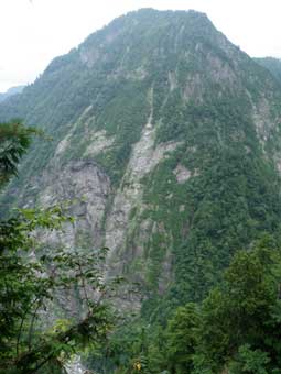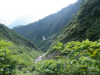 ![]() 仙人池ヒュッテから仙人温泉までが意外に遠かった。 左の写真で湯気が出ている所が仙人温泉の湯元で、 仙人温泉小屋は沢を挟んだ対岸にあった。 |