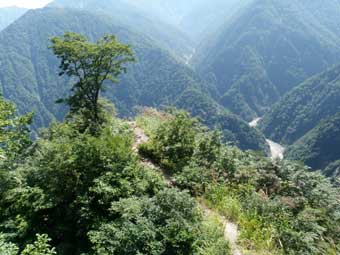 仙人温泉から仙人ダムの間も歩きにくい道が続く。 少し進むと稜線伝いに降りる道になるが、木を切り倒し強引に付けたような道で滑りやすく 固定ロープの付いているところが多かった。 日差しが強くなり腕が焼けてヒリヒリしていた。 薄手の長袖シャツを持ってこなかったことを後悔した。 つま先が痛くなってきたのでゆっくり降りた。 |