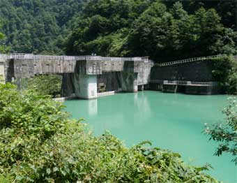 ダムの直前で沢を渡るところがあり、ここで水を補給したり顔を洗ったりした。 11:50ようやく仙人ダムに到着した。 |