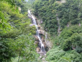 少しトラバース道を進んでから200メートルくらいの急登になる。 息を切らして登った。 200メートル登ると水平歩道の始まりだ。 急な斜面や垂直の岩壁を削って作られた狭い道が延々と10キロくらい続く。 雨が強くなって合羽の上着だけ着たりしたが、小雨になってまた脱いだ。 水平歩道を歩き始めて最初の見物は折尾の大滝だ。名前は折尾だが地図上の折尾谷より手前の沢だ。 ここは飲み水が補給できる。 |