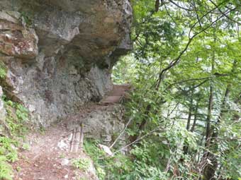 岩壁をコの字形に削った道が続く。 多少雨が降っても濡れないというメリットがある。 |