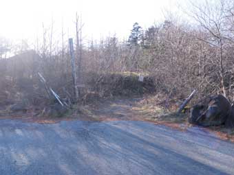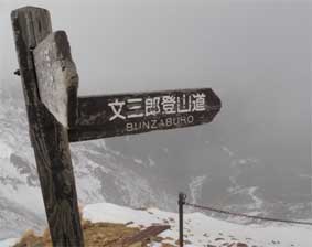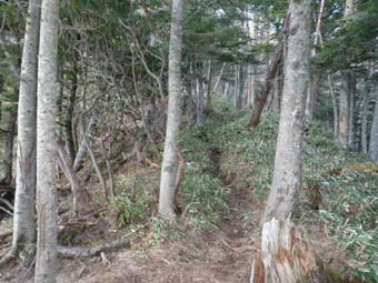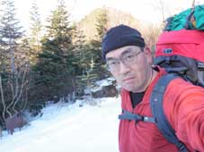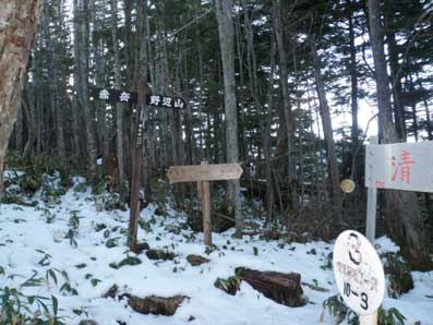 車道終点から45分歩いて尾根への取り付きになる。 ここに、登山道入り口という標識があった。 いままでの道は登山道ではなかったのか。 つづら折りの登りを少し辿ると尾根の雰囲気になる。 このあたりで下山してきた単独行の人とすれ違った。 歩き始めて初めて会った人なので 挨拶の声もつい大きくなった。 約1時間で小天狗に到着。雪が現れてきた。 日没近くまで歩いてどこかで幕営しようと考えていた。 |