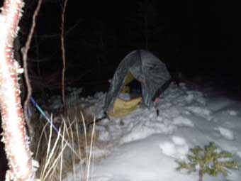 2230メートル付近で幕営することにした。気温2℃ 今回は冬用の外張りでは無く、 軽量な夏用のフライにした。 夜も快晴で満天の星がきれいで、満月に近い月が 天井の照明のように輝いて明るかった。 テントを張り終えて持参の缶ビールを飲んだ。 夕食は定番の日清焼きそば1.5倍。 キャベツとソーセージを入れた。 今回は新渡戸稲造の「武士道」の文庫本を 持参していたので少し読んで寝た。 |