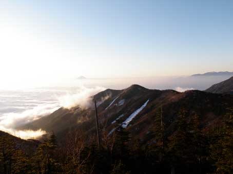 11/29(日) 朝は4:30に目が覚めた。理想的な時間である。 気温0℃。 朝食はカップ麺の”どんべい・きつねうどん”の 中身だけを持ってきたのでコッフェルで煮て食べた。 朝食はラーメンよりうどんの方が 食べやすい気がしている。 6:10出発。同じルートを下りる可能性もあるが、 状況により真教寺尾根か反対側の美濃戸口方面へ 下りられるようにテントもたたんで全荷物をて携行した。 すでにヘッドライトは不要なほど明るくなっていた。 振り向くと雲海の上に富士山が姿を現していた。 少し進むと赤岳の眺めの良い場所があった。 恐らく現場監督さんが幕営した場所だろう ![]() |