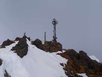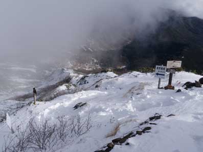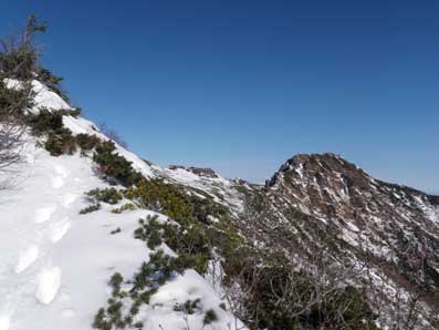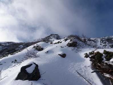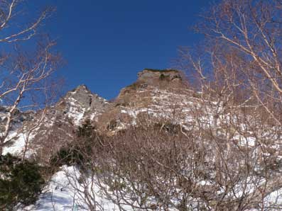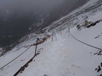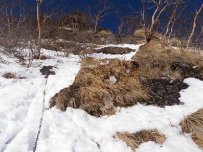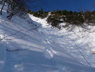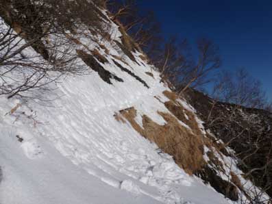 まだ雪が少なくて鎖が見えていたから分かったが 鎖が雪に埋もれていたらダブルアックスで 雪の斜面を登っていけるだろうか。 ここは、登りながら下りるのはやだな、と思わせられた 場所だ。 その後も昨日下りてきた人のトレースがあったので ルートは分かったが、柔らかい雪ではかどらなかった。 |