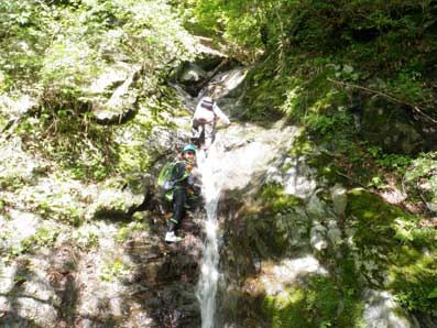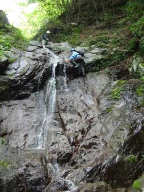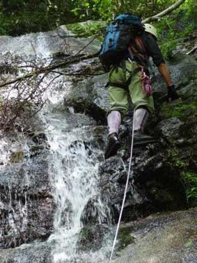 くの字型の滝(F3:左)も確保無しで登れるが、 ここに来るまでに既にお助けひもを使用しているので 新人2隊員はロープで確保して登ってもらった。 右はF3の上半分(撮影F隊員) |