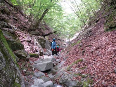 沢から上り詰めた所を通り越し、右上の写真のような所を超えてしばらく下りたところに西沢出合へのルートがあった。