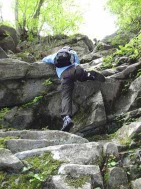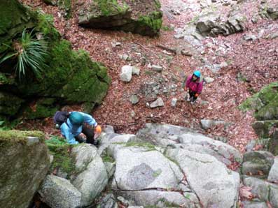 F4を登っている時に4人パーティーが追いついてきた。 茅ヶ崎山岳会だと言っていた。F5で先にいってもらった F5は中程に段差がある。(左の写真:撮影F隊員) 右側から登れば簡単だが水流沿いに登ると少し難しい。 今回私が一番緊張したのはここだった。 その先水が涸れる |
