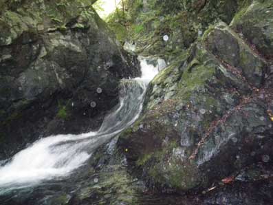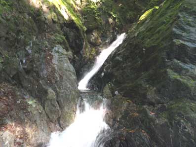 下りた沢はキャンプ場の建物が見えるところで 生活ゴミがありあまり良い雰囲気ではなかった。 沢を横切るワイヤーに立ち入り禁止という看板も有ったが 沢登りを禁止する以外の何か意味があるのだろうと考え 気にしなかった。 左は入渓して20メートルくらいのところで下流を振り返って 撮った。 作業用のモノレールも横切っていた。 小さい段差をトラバースしたあと最初に現れるのが 右の小滝で左側を登ったがきわどかった。 木にしがみついてなんとか登った。 |